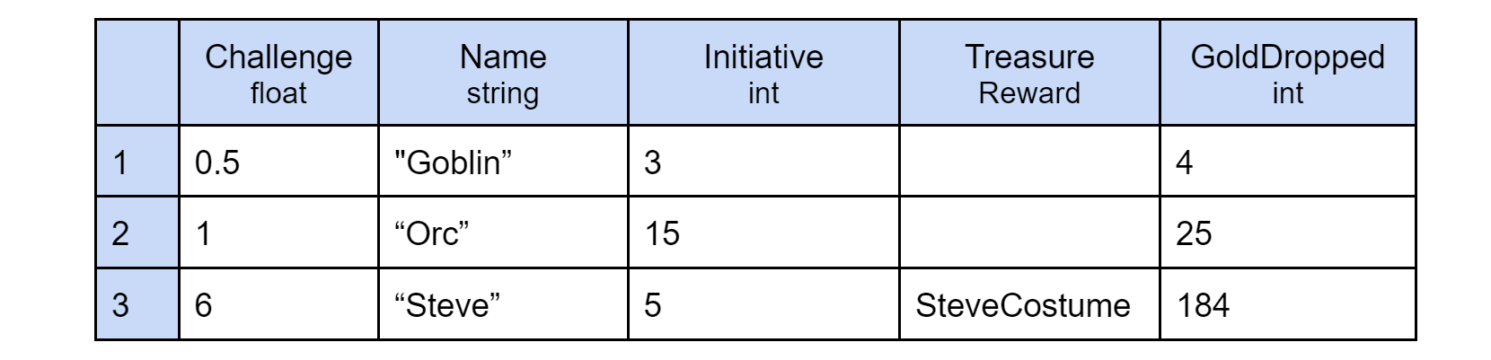 The idea is that each row is a set of similar data, and you’re doing the same operation on different sets depending on the circumstances. Let’s say you’ve got a table named Enemies that contains details about various enemy encounters: