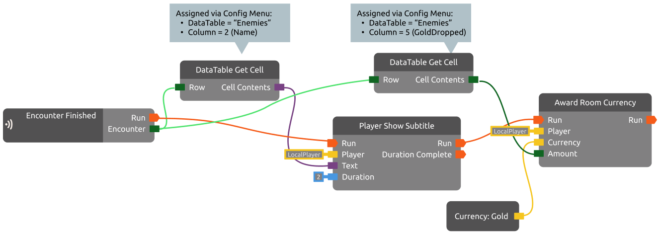 You can also search for information within the Data Table. Using DataTable Get Rows Containing or DataTable Get First Row Containing you can reference row information based on the name string “Goblin” (sorry, exact matches only). Or you can pull a random Challenge 6 enemy to throw at your players without having to hard-code what row in the table they’re on.